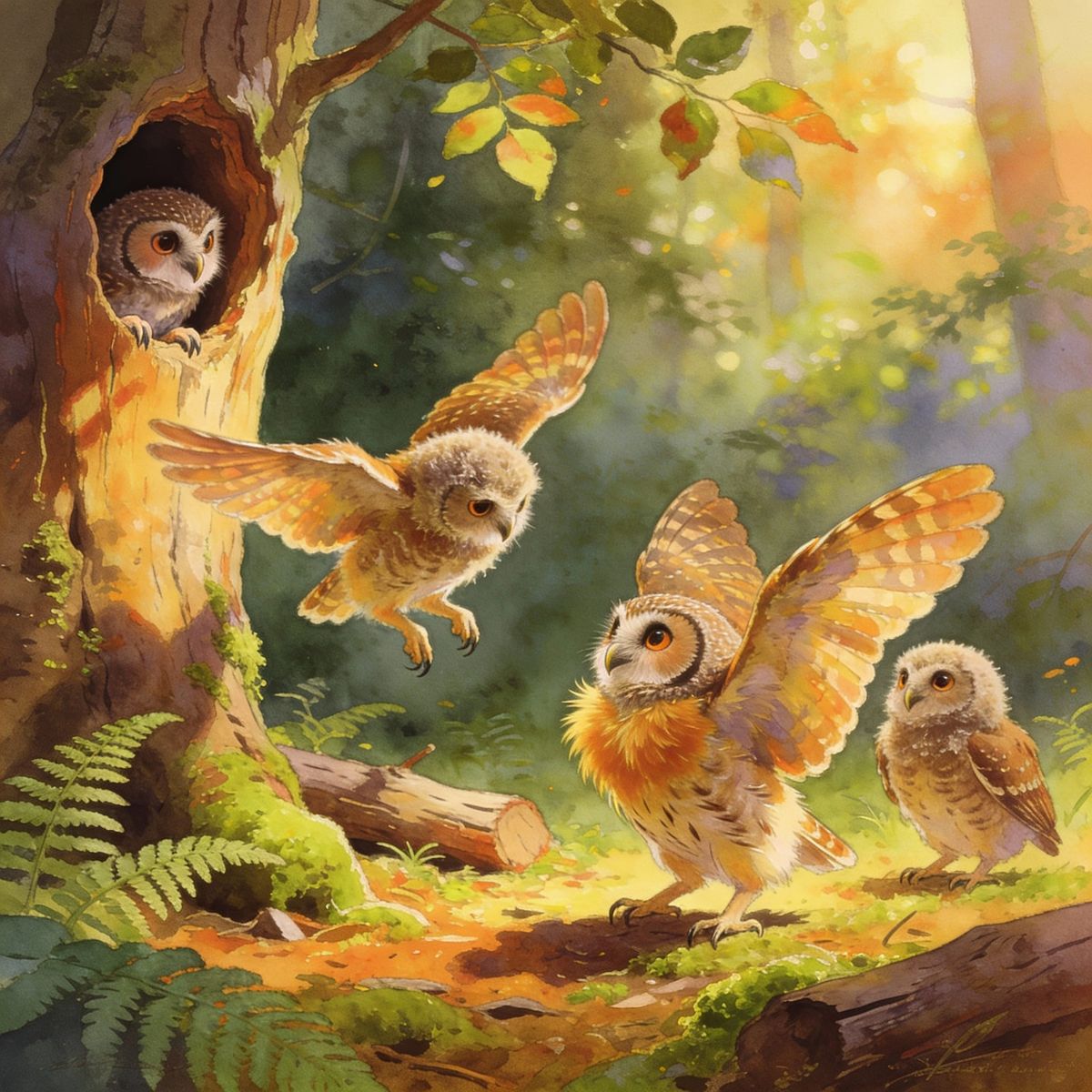 A naturalistic illustration of young screech owls leaving their tree hollow for the first time. Features detailed rendering and soft forest lighting, capturing a moment of wonder.