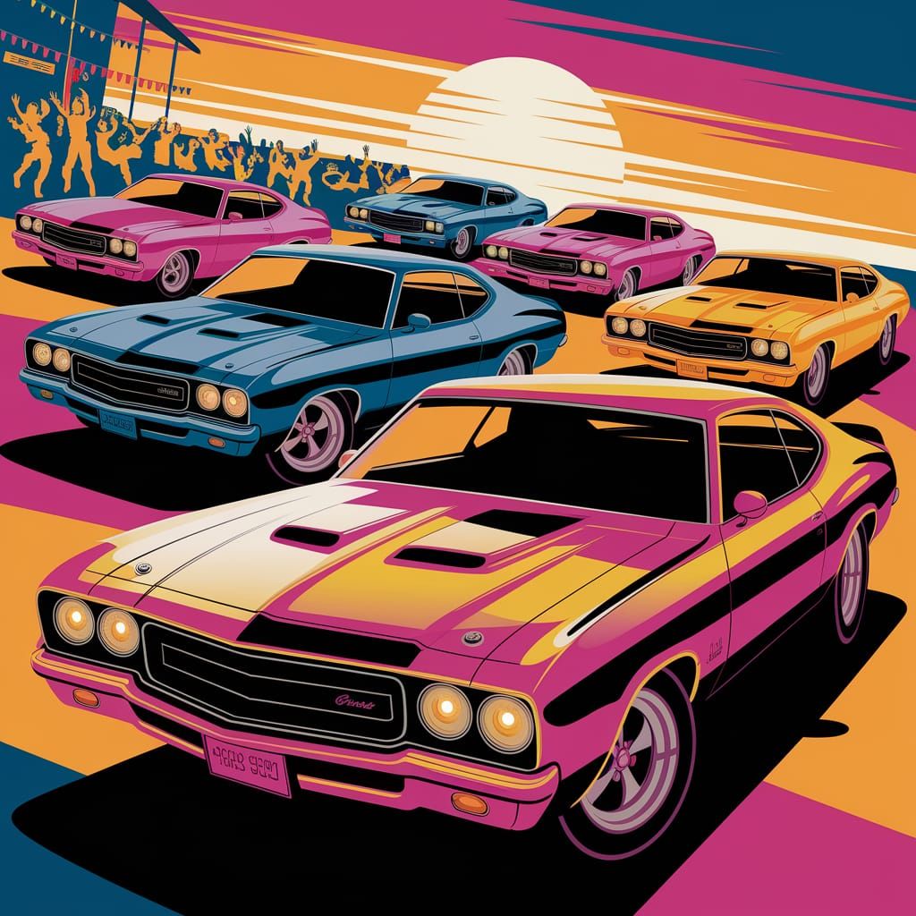 This image shows a lively illustration of multiple classic muscle cars parked under a vibrant sunset sky, surrounded by music, laughter, and a bustling street party.