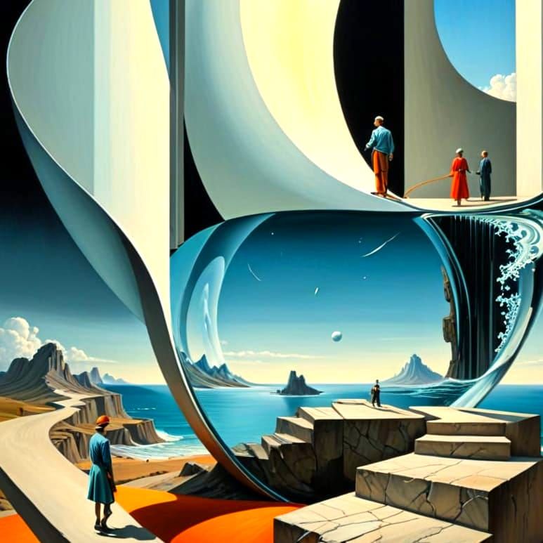 beautiful complex fantastic surrealistic asymmetric unbalanced dynamic composition by Andreas Lie, Gabriele Viertel, Leandro Erlich, M.C. Escher, Salvador Dali, Edward Hopper, Igor Morski, Kuzma Petrov-Vodkin, Nicholas Roerich, Paul Delvaux, Rene Magritte, Van Gogh, Stewart Edmondson, Kay Sage