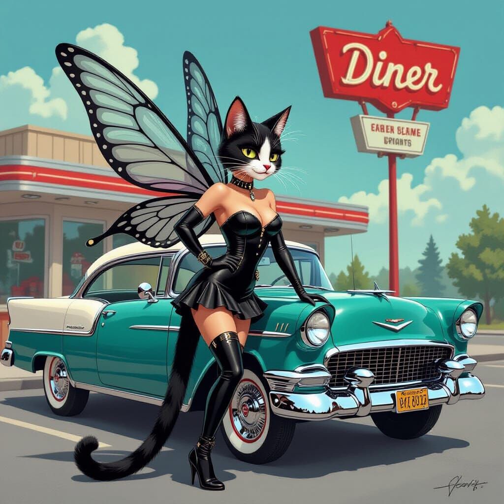 This image features a cat fairy dressed as a 1950s greaser, complete with leather wings, posing beside a classic Chevrolet. The scene evokes vintage Americana with a surreal twist.