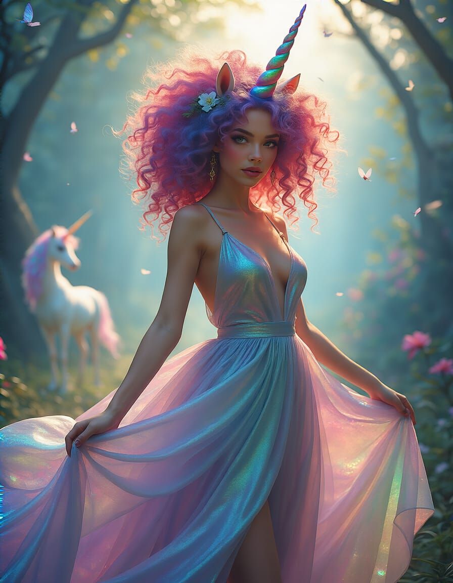A full body shot of a woman with a unicorn horn and colorful, curly hair, wearing an iridescent dress. The image has a whimsical, dreamlike quality with fantastical elements.