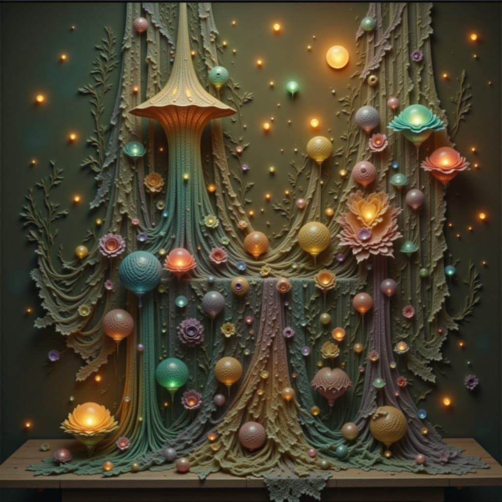 This image presents a dreamy, surreal artwork with flowing organic shapes and intricate lace details. It features smooth rainbow transitions, subtle iridescent highlights, and soft ethereal light, rendered in a pure digital art style.