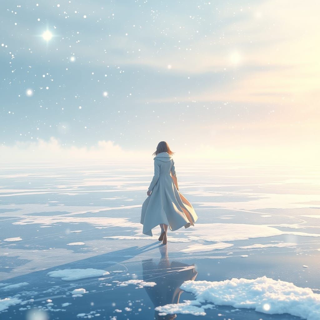 This stunning 8K digital painting captures a serene young woman in a flowing white coat walking on a frozen lake surrounded by gently floating snowflakes, evoking the breathtaking world of anime and concept art with intricate details and soft, ethereal lighting.