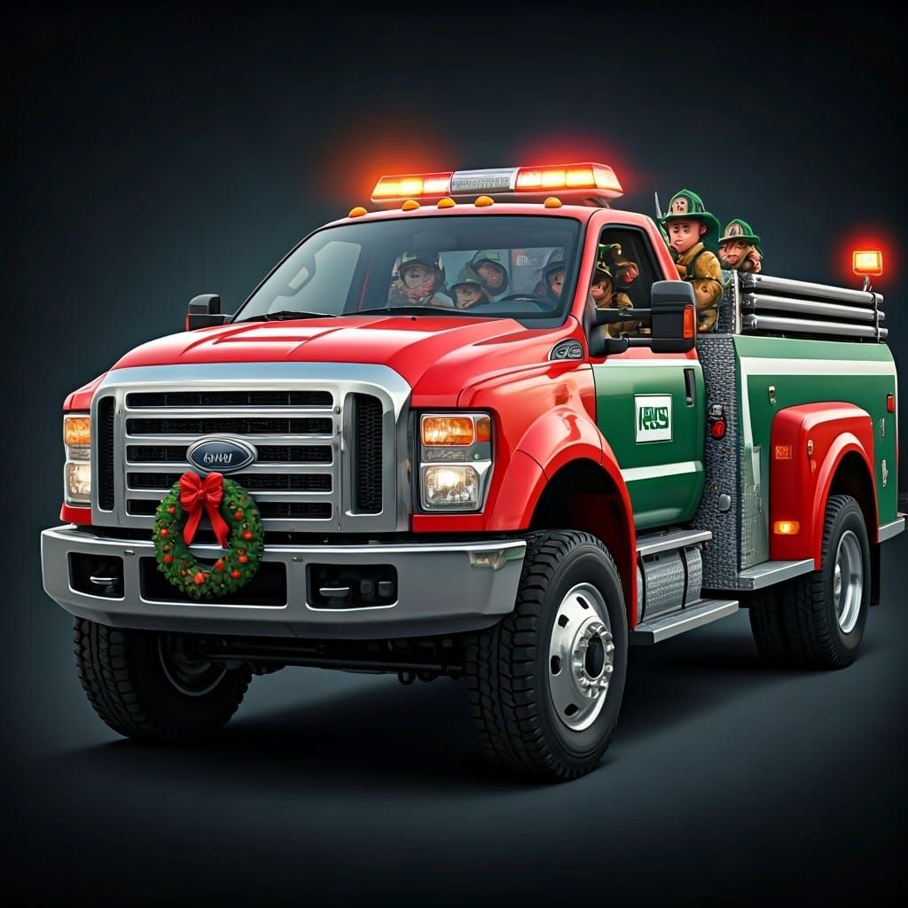 This festive image shows a detailed, red and green Hess truck with a Ford Super Duty design, featuring a brush truck body and miniature kids in green and white firefighting uniforms. The truck is adorned with chromed-out accents and a Christmasy wreath, with siren lights flashing brightly.