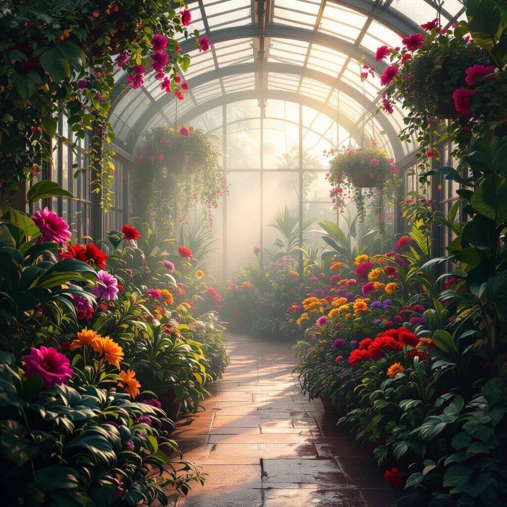This image shows a dreamlike, nostalgic greenhouse brimming with vibrant flowers and plants, bathed in warm, cinematic light. A highly detailed digital matte painting with maximalist composition.