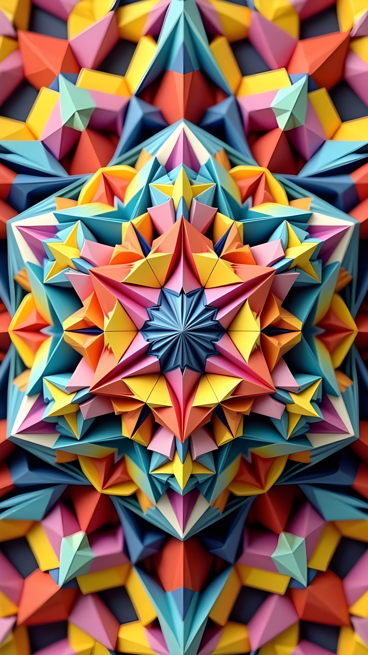 This image features a detailed abstract vector fractal of a complex geometric polyhedron. It incorporates elements of origami, papercraft, and vibrant splash art with high contrast and intricate details.