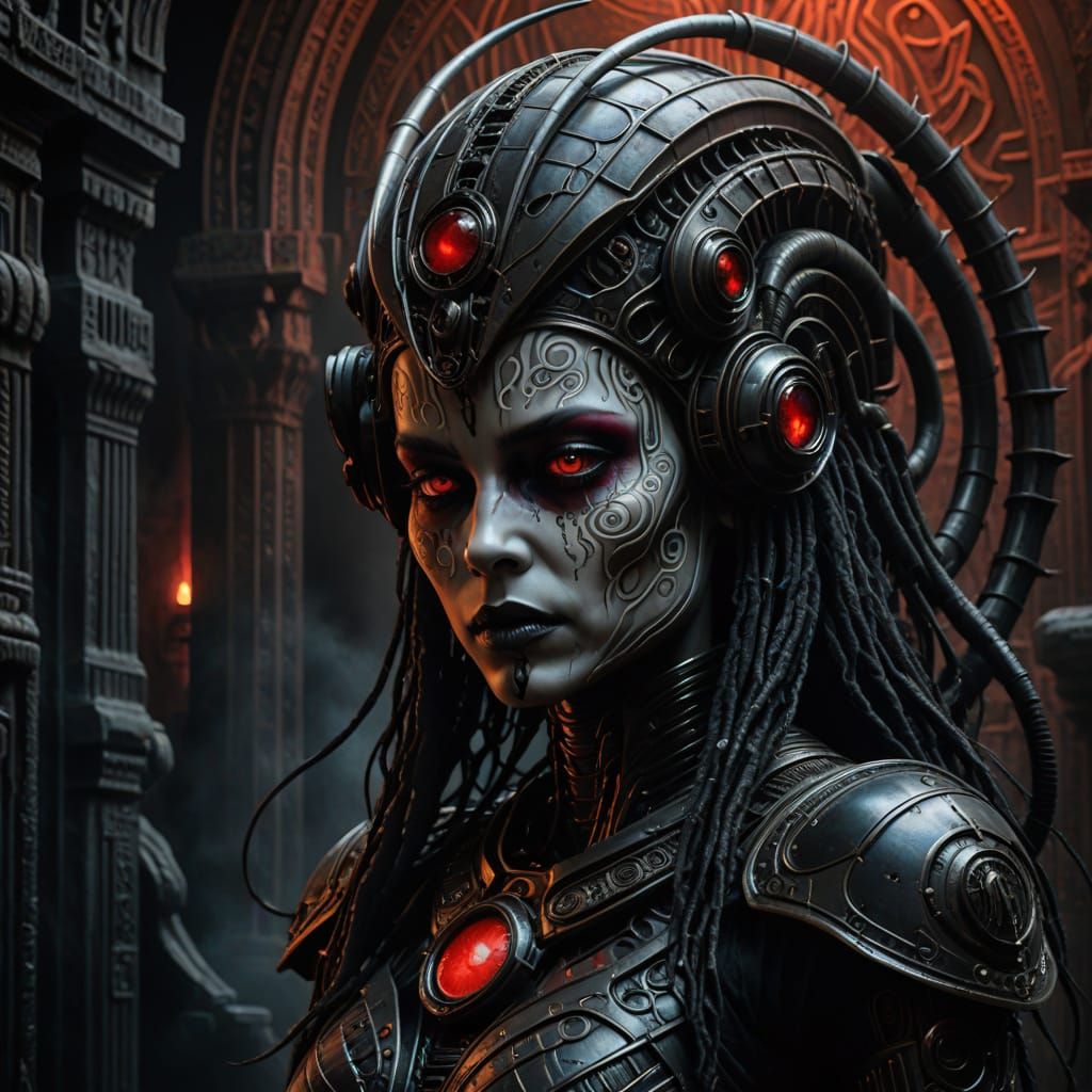 This image shows a close-up of a biomechanical princess in a dark, surreal setting. The princess has intricate metallic details and pulsing red eyes, set against a smoke-filled ancient temple background with neon accents and low-key lighting.