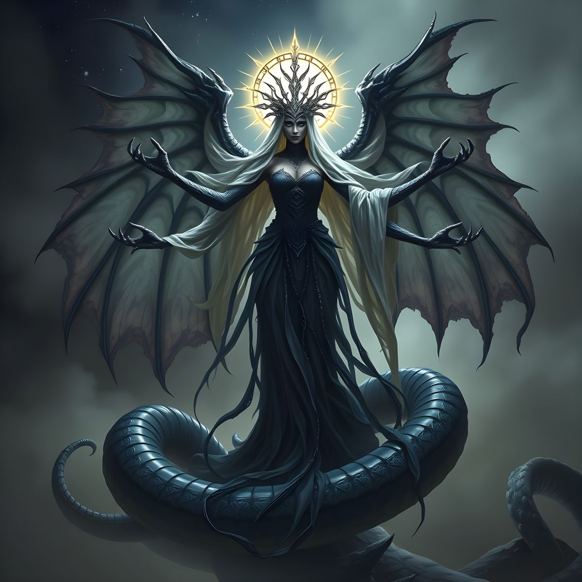 This image shows an original, monstrous creature named Nyxalith. The serpentine, multi-eyed queen has vast wings and six arms, and is an eldrich hybrid of nightmare entity and forgotten goddess.