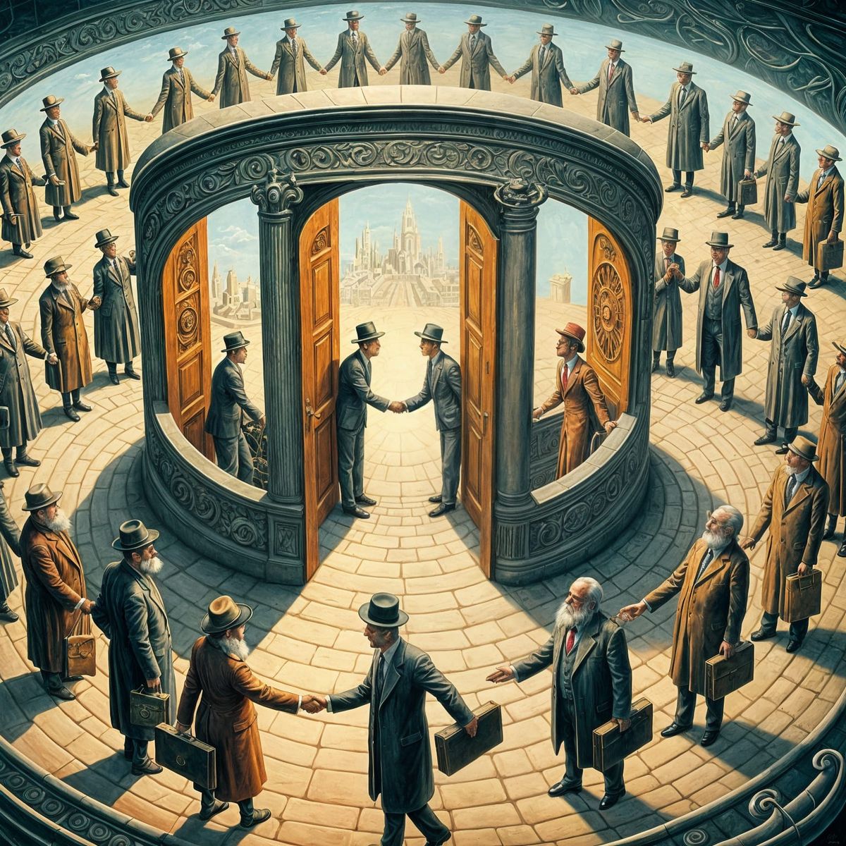 This digital painting depicts the symbolic revolving doors between corporate and government, where clandestine agreements and handshakes are made, excluding those from less affluent backgrounds.