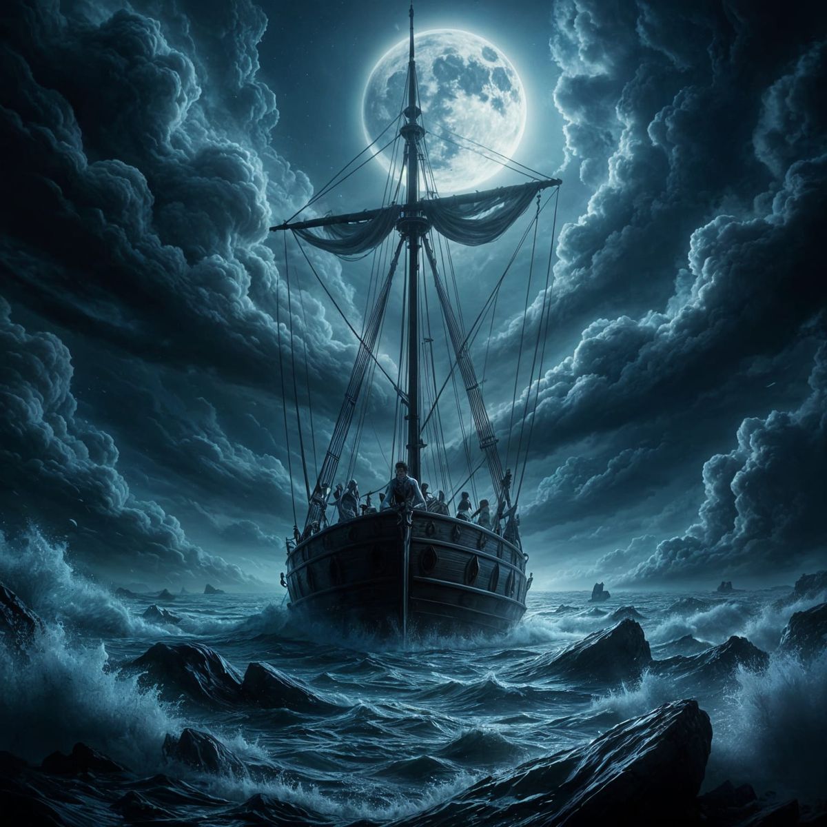 A heroic prince stands ready for battle on a stormy night, sailing his ship through treacherous waters under a full moon.