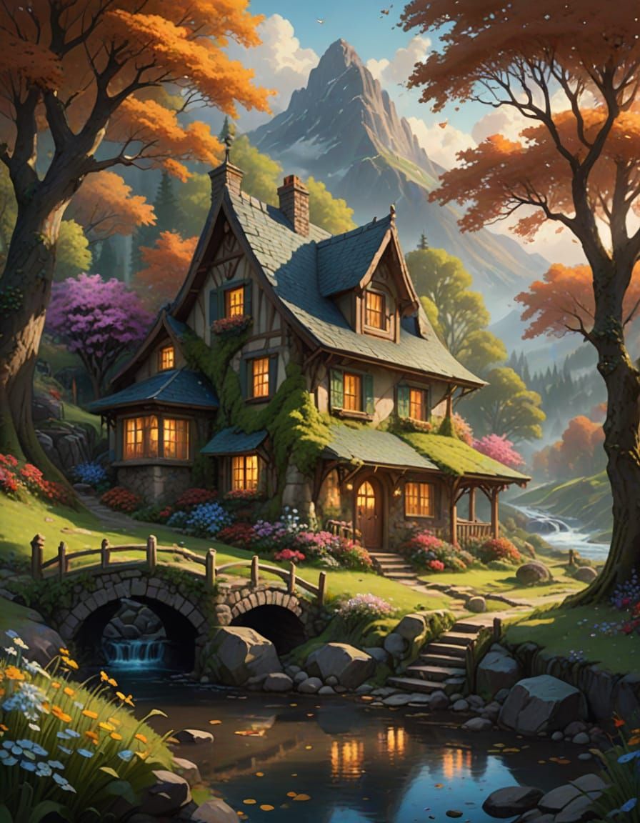 A whimsical fantasy scene featuring a cottage nestled in a valley beside a river. Leaves and flower petals swirl in the air, illuminated by soft, warm light in a dreamy digital painting.