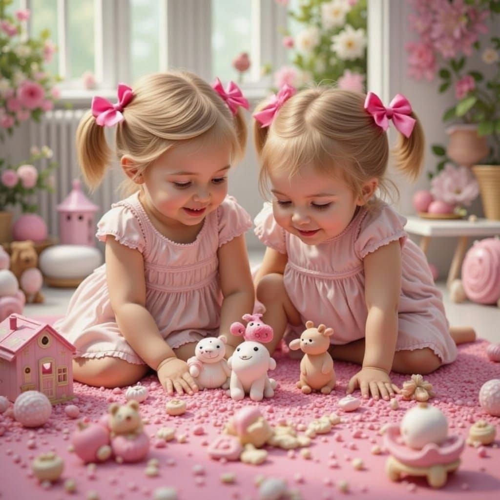 This image presents a realistic photo featuring cute critters surrounded by pink candy and toys, evoking a sweet and playful atmosphere.