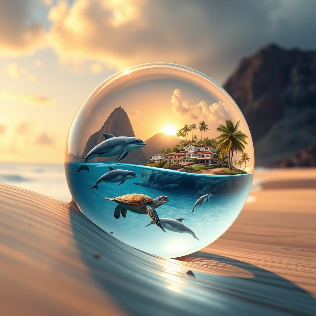 This stunning image shows a serene beach scene at sunset, with a giant water droplet teetering on a wave, containing a 3D miniature landscape of Tenerife, complete with volcanic features, lush vegetation, and a traditional village, all surrounded by dolphins and a sea turtle in a kaleidoscope of colors.