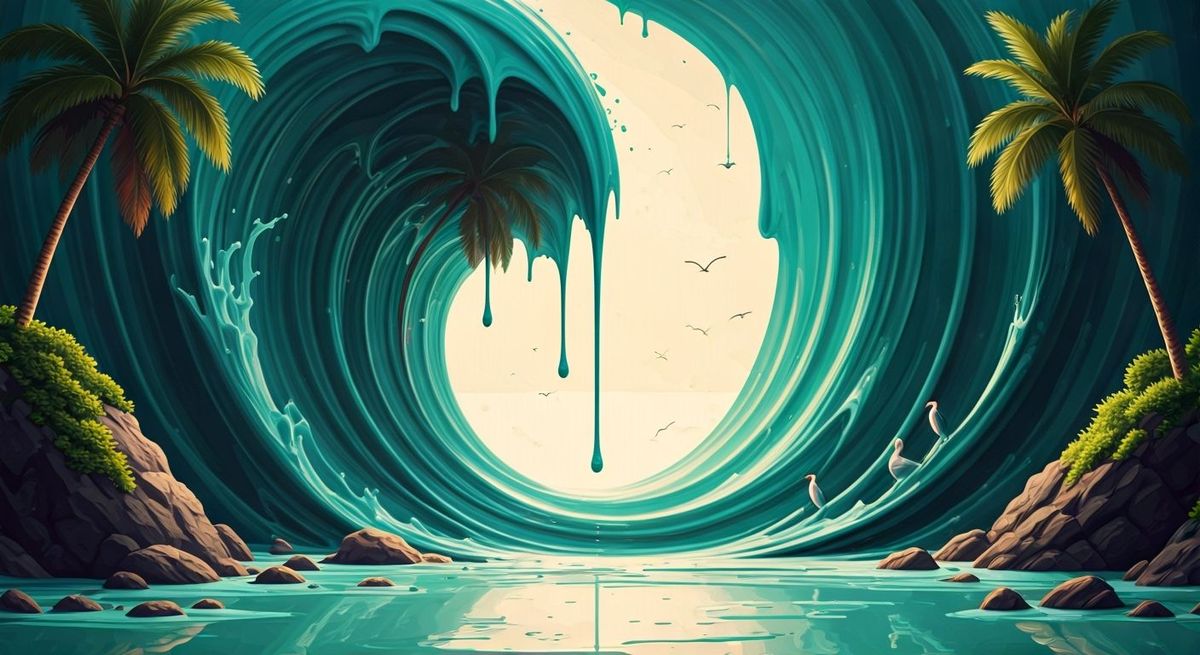 A surreal, illustrative image of vibrant teal paint flowing to create a tropical beach. The scene includes palm trees, rocks, and seabirds in a glossy, dynamic composition.