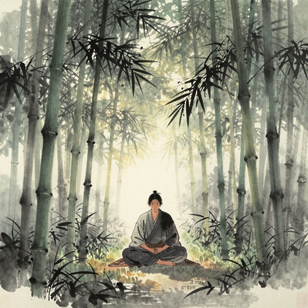 This image depicts a lone samurai meditating in a tranquil bamboo forest as dawn breaks. The artwork features muted colors and delicate brushstrokes, evoking a peaceful, atmospheric scene.