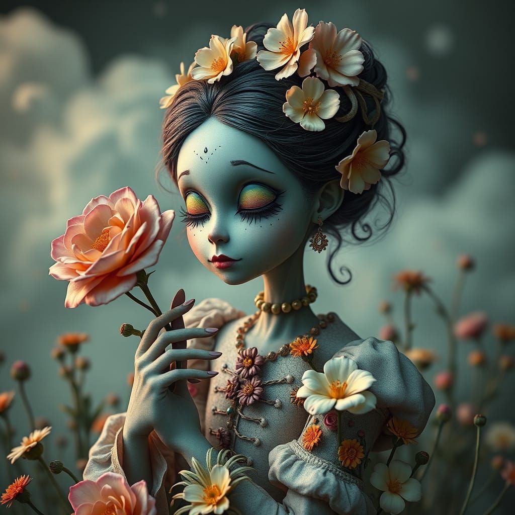 A whimsical image of a smiling woman building a fantasy world. The scene features pastel colors, flowers, and gothic, surreal details in a dark, sentimental style.