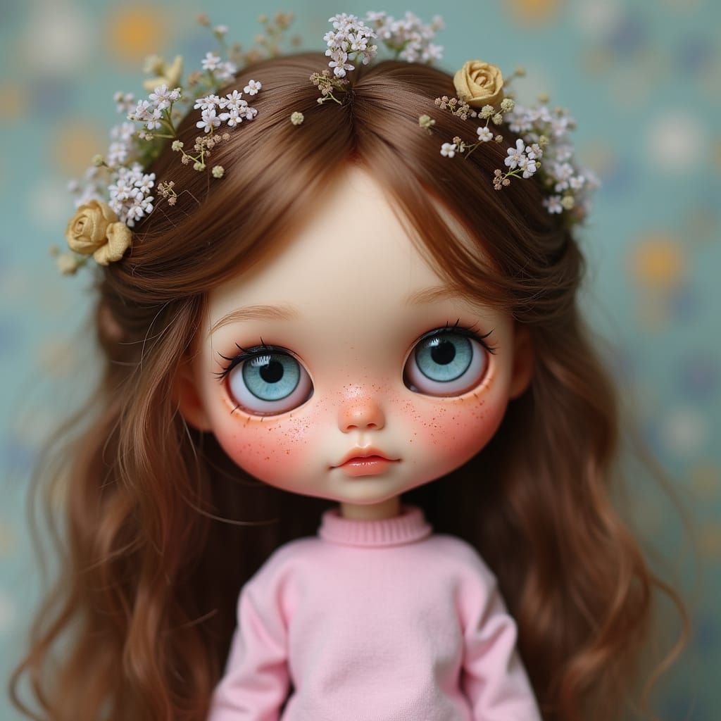 A whimsical portrait of a Blythe doll with blue eyes and brown hair decorated with elderflower. The doll has a soft blush and freckles, and is wearing a light pink shirt, rendered as digital art.