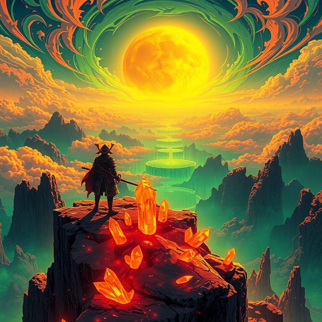 This image shows a lone samurai warrior overlooking a neon landscape. The scene, rendered as 3D anime art, features glowing crystals and swirling clouds in shades of neon green and orange. The style evokes courage and adventure.