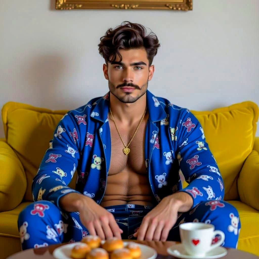 full body figure. very handsome man. age 25. unkempt black hair. grey green eyes. in face tired sleepy expression. bushy eyebrows. beautiful well-drawn fleshy mouth. thin moustahe well trimmed. well-defined physique. very hairy chest. he wears a pajama jacket and trousers unbuttoned for half dark blue ...