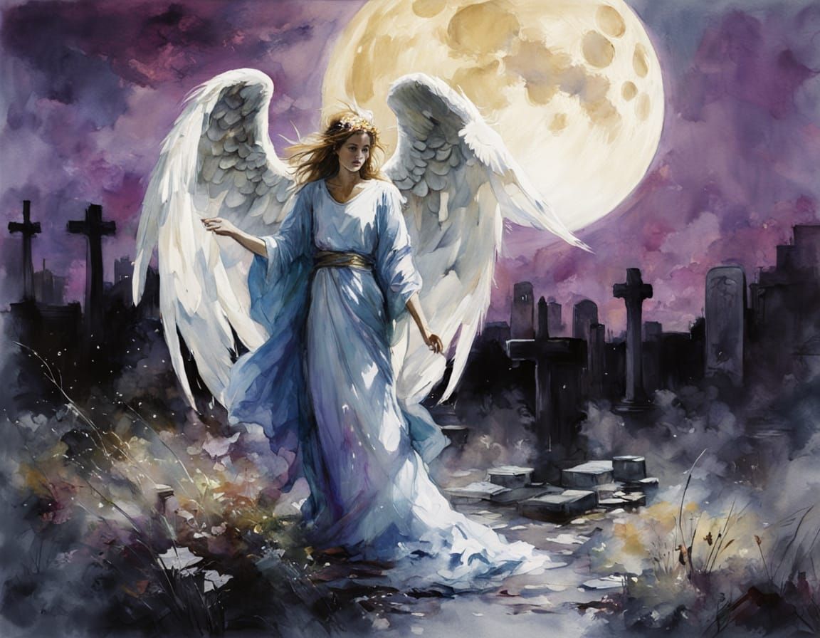This image depicts a beautiful, watercolor-style angel of death surrounded by a graveyard, bathed in the soft glow of a huge full moon. The artwork features rough paint strokes and textures, evoking a sense of fine art drama and romance.
