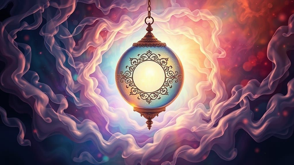 This image depicts a delicate crystal ball suspended in a swirling vortex of iridescent mist, evoking a surreal and psychedelic atmosphere reminiscent of surrealist masterworks and psychedelic art.