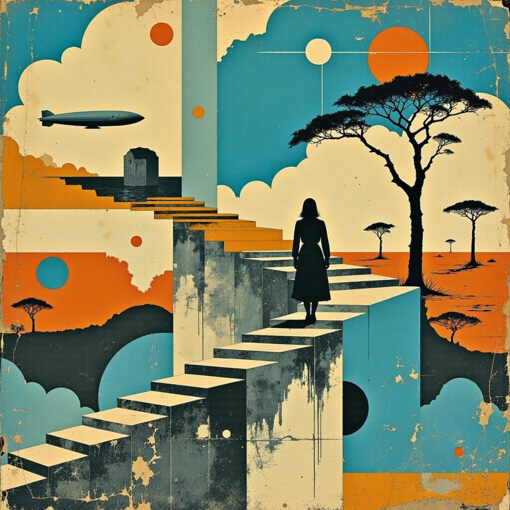 "Zeppelin, Paul Klee, Cool blue colors, stairway to nowhere, abstracted emotionally charged atmosphere, burnished gold sparkle ✨✨✨, Maxfield Parrish J. C. Leyendecker African Savannah, baobab trees, sketch intricate details cinematic dramatic matte painting colorful kaleidoscope geometric <lora:Akimora:1.0> <lora:CorvidiconFlux:1.0>"