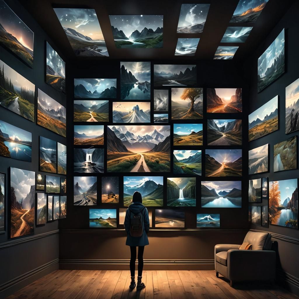 This image shows a person gazing at images representing their dreams and future aspirations. Cinematic lighting and hyperrealism enhance the scene's visual impact.