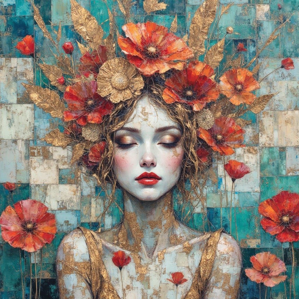 A digital portrait of a fairy-like goddess surrounded by fire and gold leaf. The artwork features vibrant, metallic colors and intricate details in a mystical, art deco style.