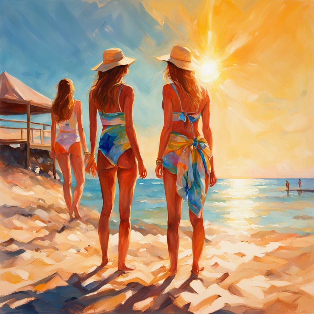 This image shows a group of women in bikinis, facing away from the viewer on a beach. The vibrant oil painting style captures the warm, golden light and summer atmosphere.