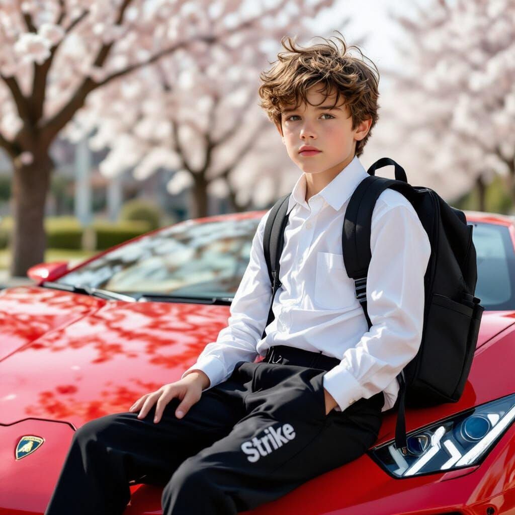 A photorealistic image of a young schoolboy with a backpack, sitting on a red Lamborghini. The scene features a warm spring atmosphere with vibrant colors and cinematic lighting.