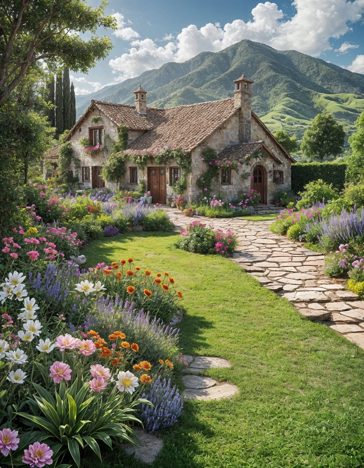 This image showcases an exquisitely detailed ancient house, intricately surrounded by vibrant flowers and flowing water. The artwork features hyper-detailed elements and perfect composition, creating a masterpiece of natural beauty.