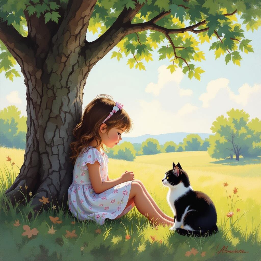 This image shows an oil painting capturing a serene moment of a young girl and her cat resting peacefully beneath a tree. The close-up view emphasizes the breathtaking detail.