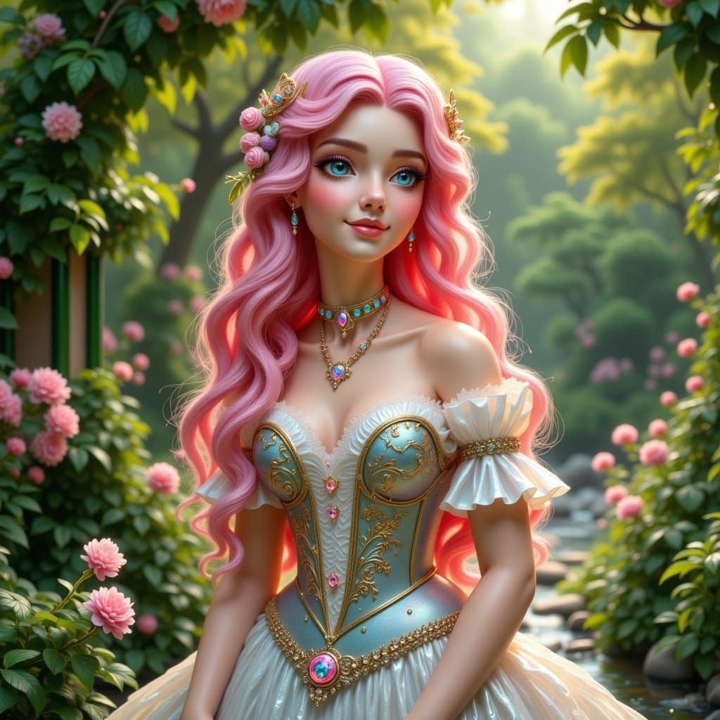 A beautiful princess with flowing pink hair, in elegant 18th-century Rococo fashion, stands in a vibrant garden. The scene features ethereal light and rich jewel tones, rendered with delicate brushwork in a classic painting style.