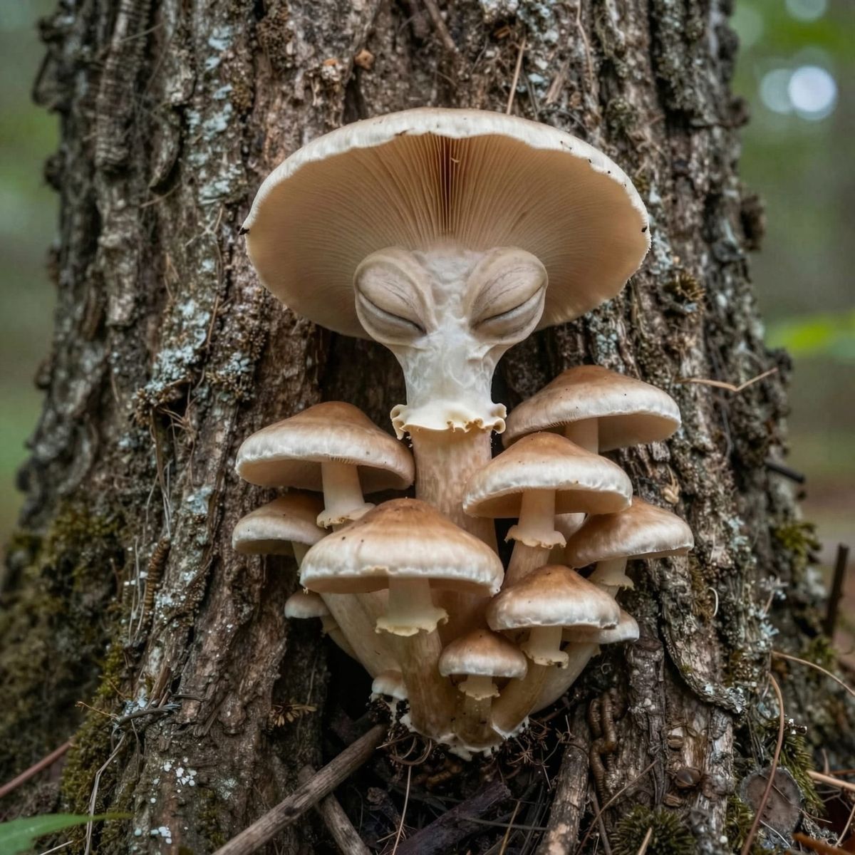 This image depicts fantastical mushrooms resembling elegant aliens with striking eyes, sprouting from the weathered roots of an ancient tree.