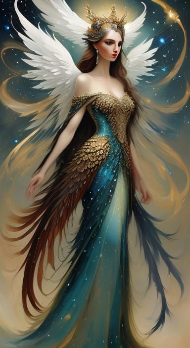 This image shows a majestic angel with feathered wings, robed in starlight, descending from a nebula. The scene is rendered in a stylized, painterly manner, evoking cosmic beauty.