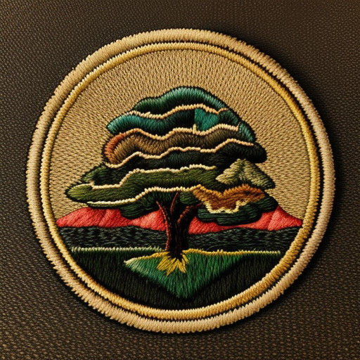 This image is a serene depiction of an earthen landscape featuring a towering brown tree, adorned with a subtle embroidered patch in warm, earthy tones, illuminated by clear and gentle lighting.
