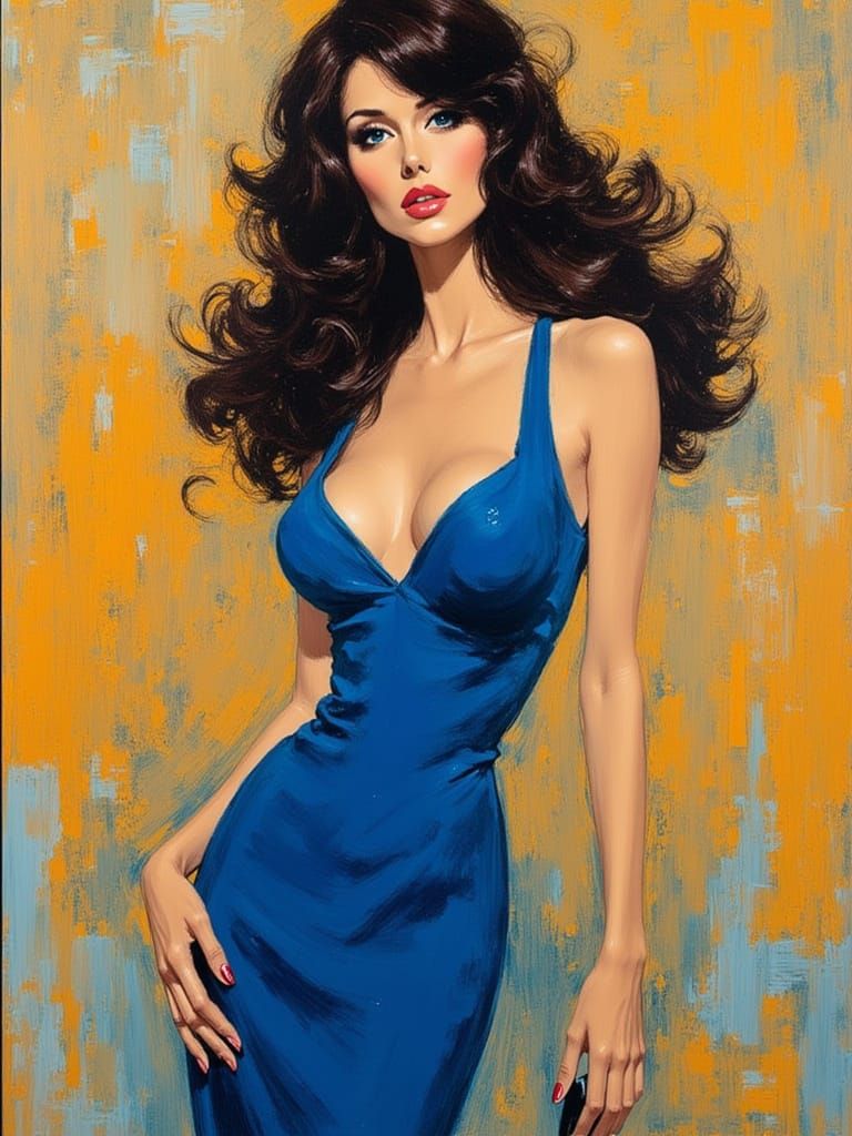 A stylized image of a brunette in a blue dress, reminiscent of 1960s crime novel cover art. The artwork employs bold brush strokes and a warm color palette in an impasto style.