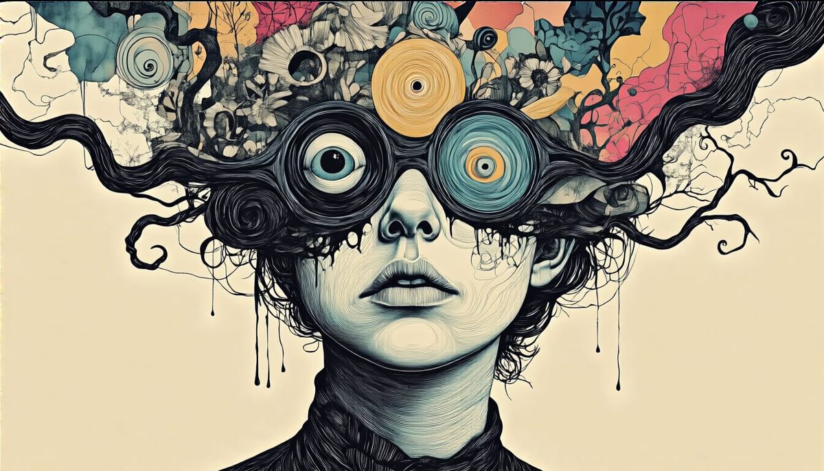 A surreal mixed-media artwork featuring abstract elements and ink techniques. The piece employs crosshatching, double exposure, and hyperdetailed linework to create a whimsical and psychedelic effect, reminiscent of a textile print.