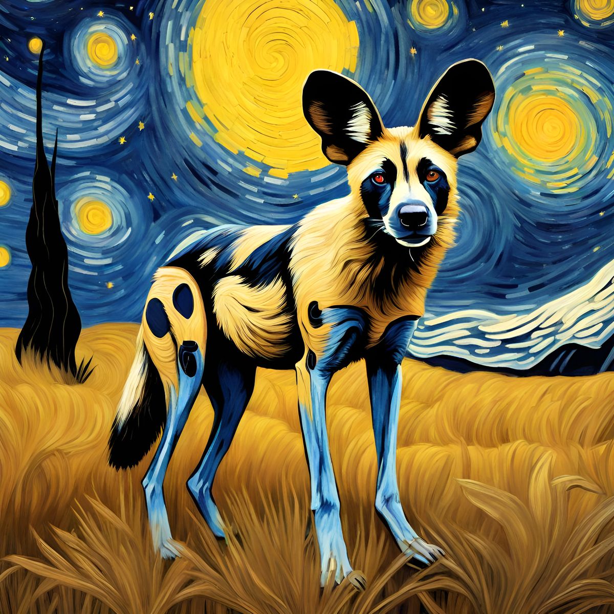 A vibrant image of an African Wild Dog in a savanna under a swirling, starlit sky. The artwork evokes the style of post-impressionist paintings with bold brushstrokes.