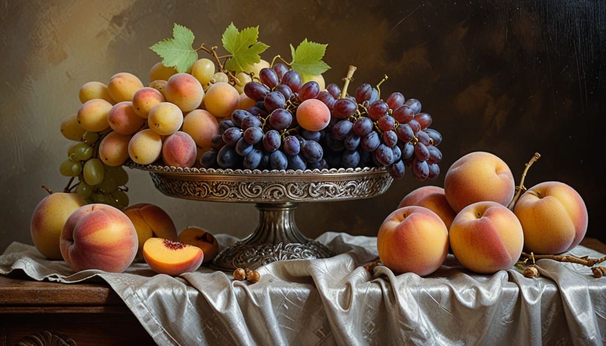 This image showcases a luxurious antique still life arrangement featuring juicy grapes and peaches on a silver platter. Rendered in an oil painting style with rich textures and warm chiaroscuro lighting.