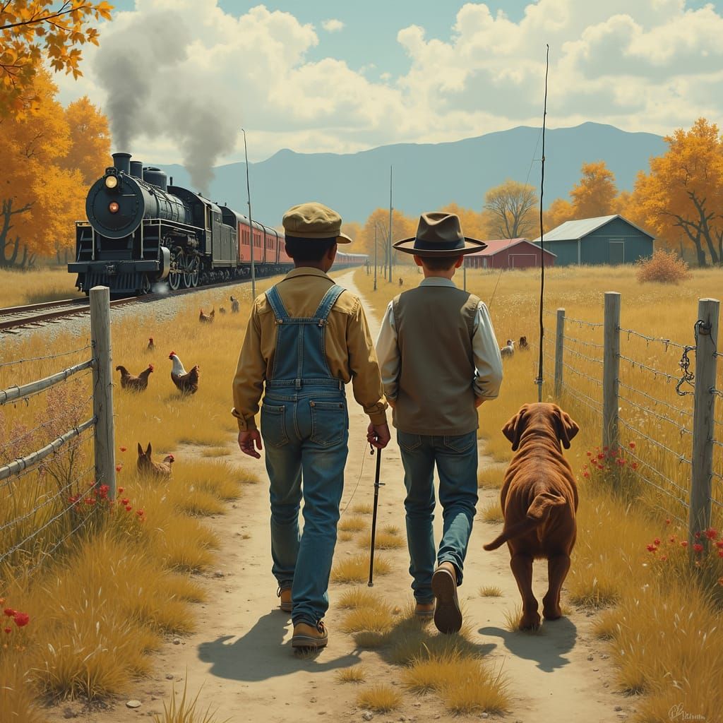 This image depicts two teenagers heading to their fishing spot, one African American, in vintage clothing accompanied by a dog. A train passes by in a nostalgic rural autumn landscape, evoking rustic charm.