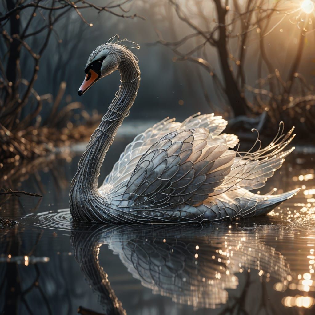 This image shows a close-up concept art piece of a majestic swan constructed from shimmering silver wire, poised for flight in a misty setting. Macro photography captures the detailed metallic texture with soft, warm sunlight.