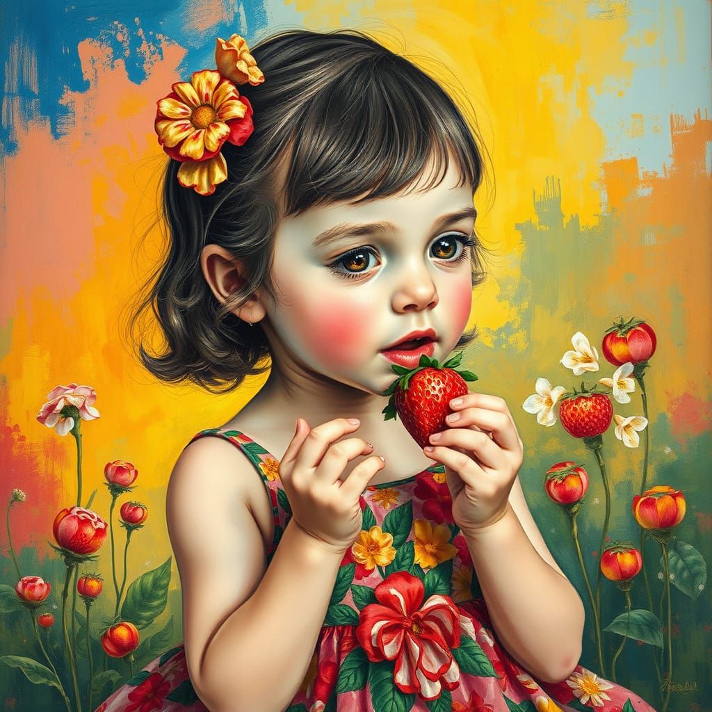 This vibrant image captures a young girl enjoying a plate of juicy strawberries, set against a colorful background, in a stunning Impressionist-inspired masterpiece with thick brush strokes and textured layers.