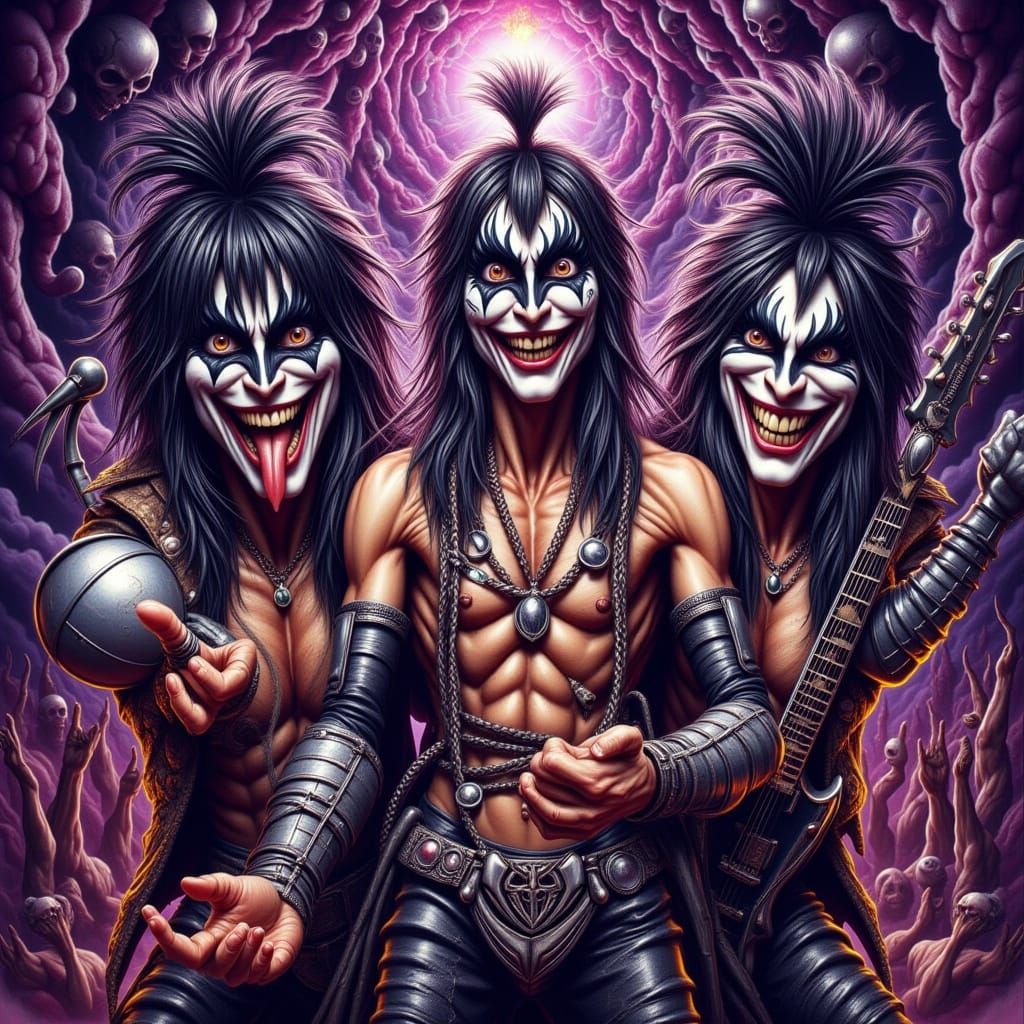 This image captures a frenzied KISS concert scene, blending pyrotechnics, smoke, and screaming fans with a fantastical, dreamlike aesthetic reminiscent of Beksiński's surrealist art and Murakami's vibrant pop culture