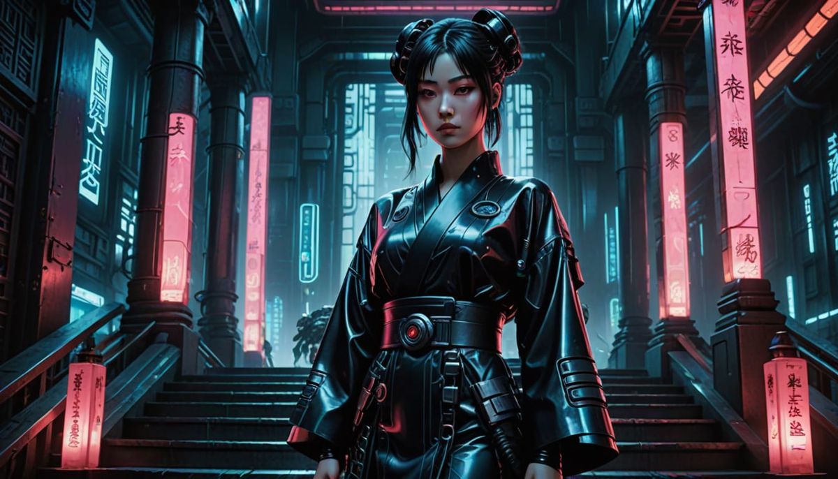 This striking image depicts a young woman in a traditional Japanese latex kimono standing on the steps of a futuristic temple. The scene is bathed in vibrant neon hues, with glowing accents and holographic advertisements adding to the dynamic atmosphere. The soft mist rising from the temple's base create...