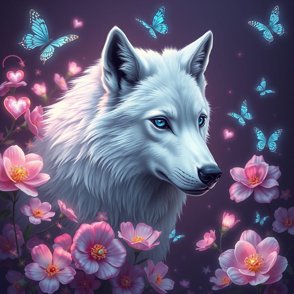 A majestic white spirit wolf, with piercing sapphire eyes and silver fur, , its posture radiating grace and power. Surrounding the lettering and wolf are soft glowing pink and purple flowers, a scattering of glittering hearts, and delicate aqua-blue butterflies; a single gem-studded butterfly with iridescent ...