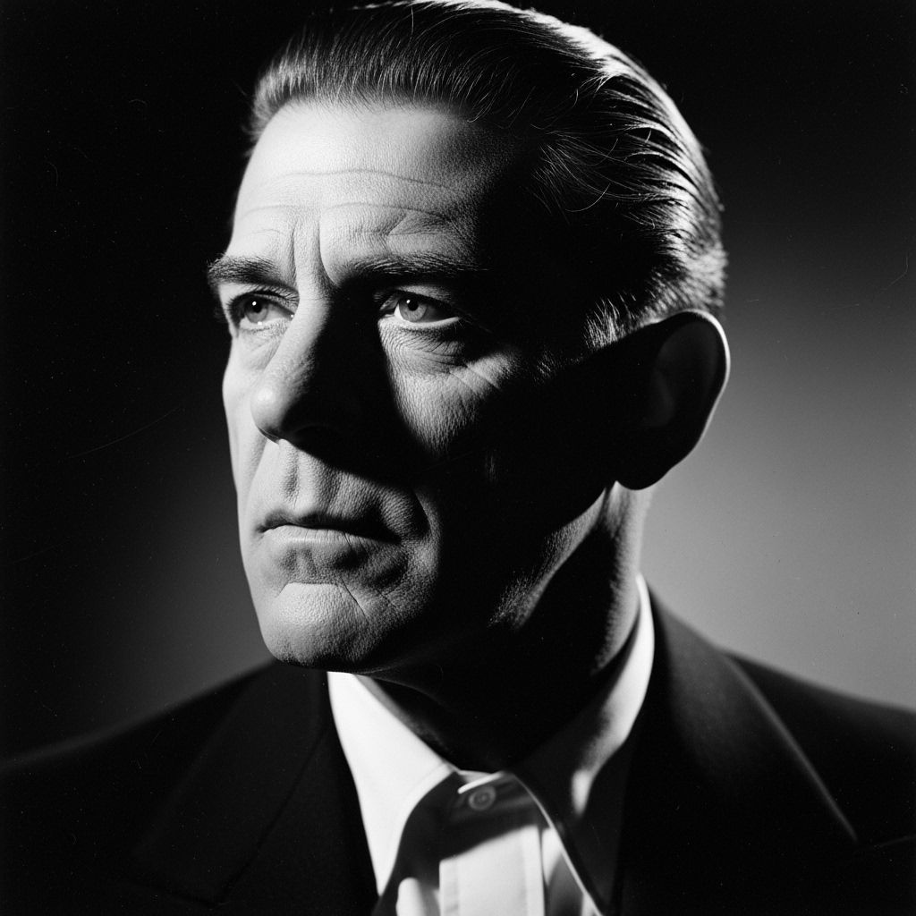 A dramatic black and white portrait of a man reminiscent of classic Hollywood photography. The subject's gaze is directed off-camera, his face illuminated by a focused light, enhancing his features in a vintage aesthetic.