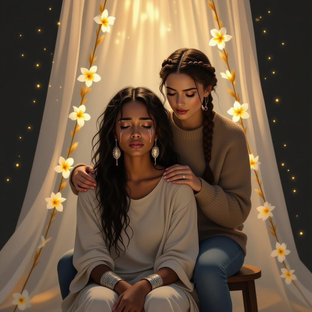This image shows a Somali woman being comforted by her Ukrainian friend. Translucent fabric emits golden particles, transforming tears into glowing paths in a magical realism style.
