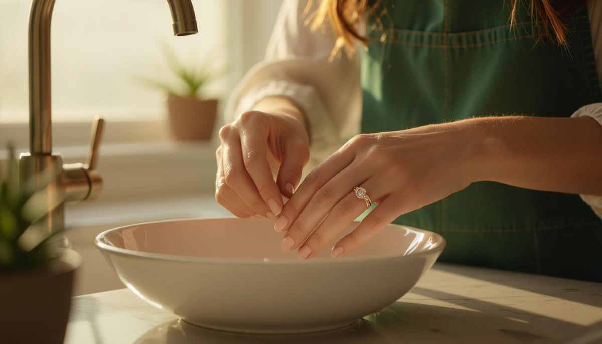 This image shows feminine hands removing a detailed artisanal ring before household chores. Warm natural light, earth tones, and gold accents create a sophisticated, atmospheric scene with a matte finish.