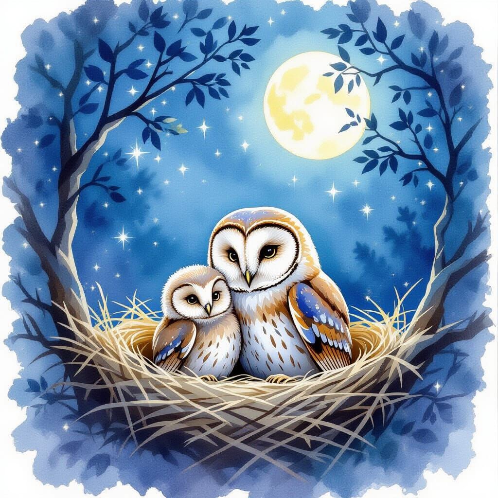 This tender watercolor illustration shows a mother owl and her owlet resting in a nest at night. A luminous moon and stars shine through branches, casting soft shadows with a gentle glow.
